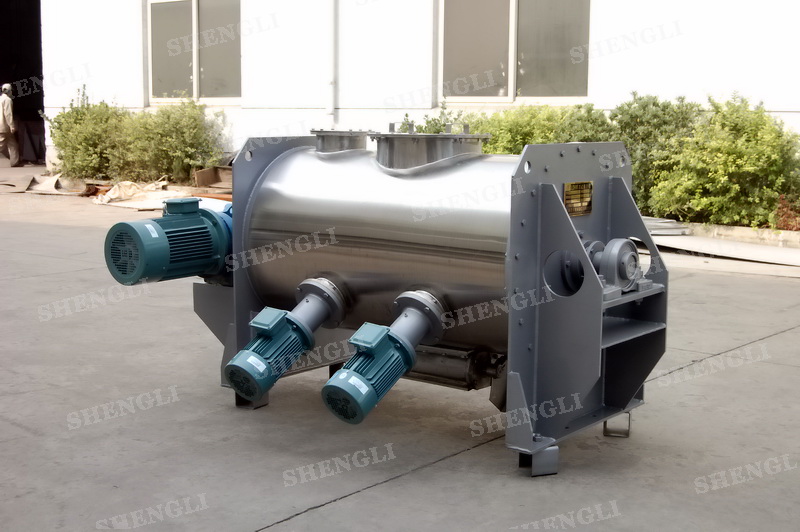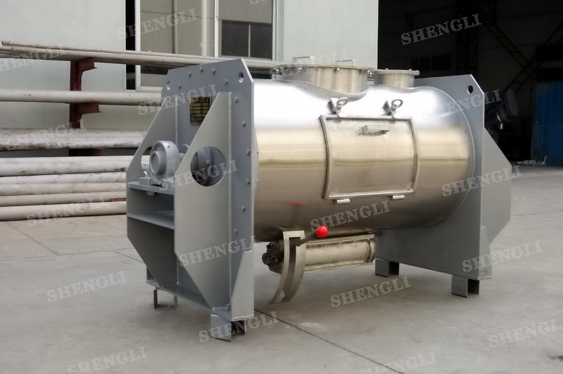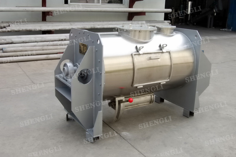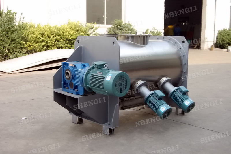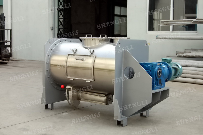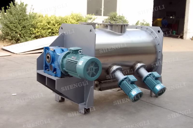 工作原理:犁式混合機(jī)采用臥式圓柱筒體,內(nèi)設(shè)平行主軸,主軸上安裝若干犁式刀頭,通過較快的旋轉(zhuǎn)速度,分割、重合物料,實(shí)現(xiàn)快速攪拌的功能,常結(jié)合1500-3000轉(zhuǎn)高速剪切飛刀相互作用。