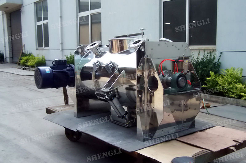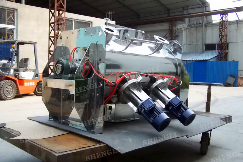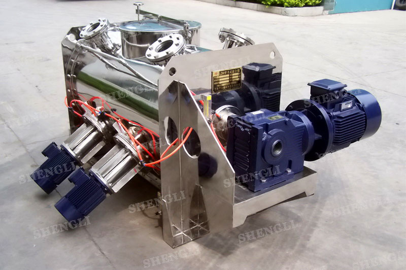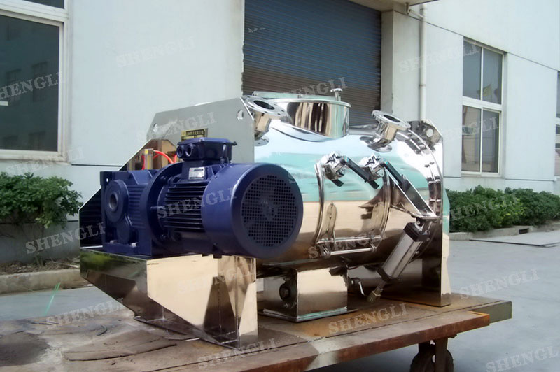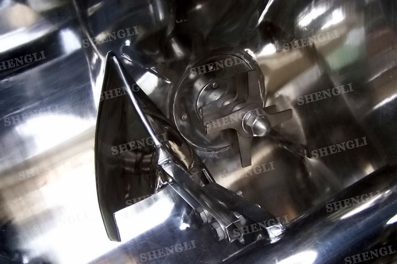 工作原理:犁刀混合機采用臥式圓柱筒體,內(nèi)設(shè)平行主軸,主軸上安裝若干犁式刀頭,通過較快的旋轉(zhuǎn)速度,分割、重合物料,實現(xiàn)快速攪拌的功能,常結(jié)合1500-3000轉(zhuǎn)高速剪切飛刀相互作用。