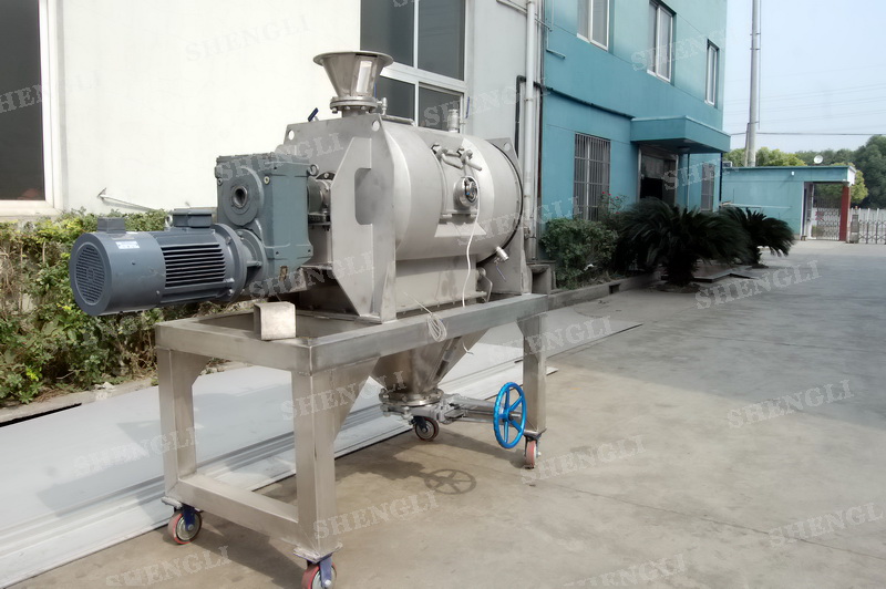 工作原理:犁刀式攪拌機(jī)采用臥式圓柱筒體,內(nèi)設(shè)平行主軸,主軸上安裝若干犁式刀頭,通過較快的旋轉(zhuǎn)速度,分割、重合物料,實現(xiàn)快速攪拌的功能,常結(jié)合1500-3000轉(zhuǎn)高速剪切飛刀相互作用。