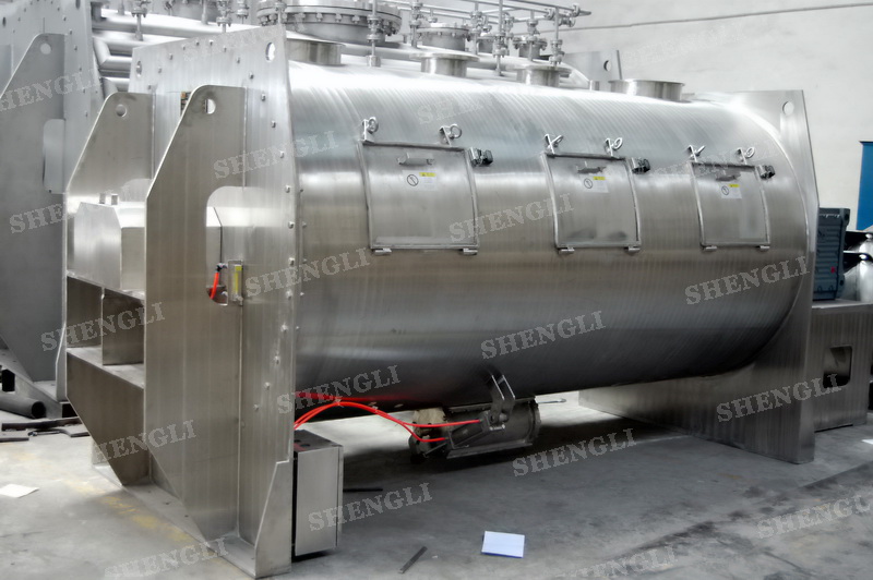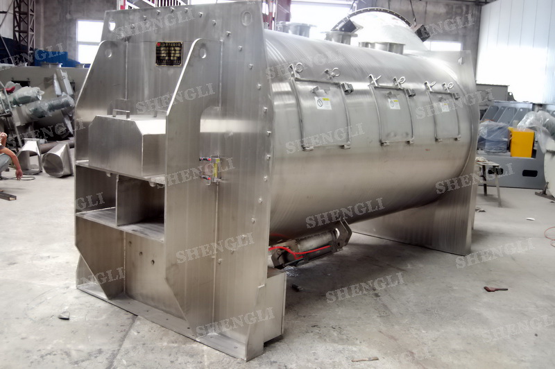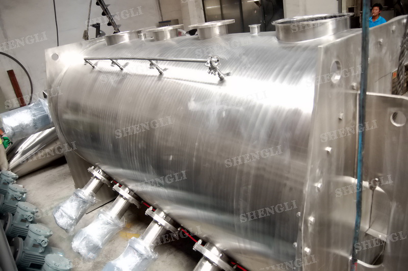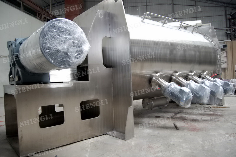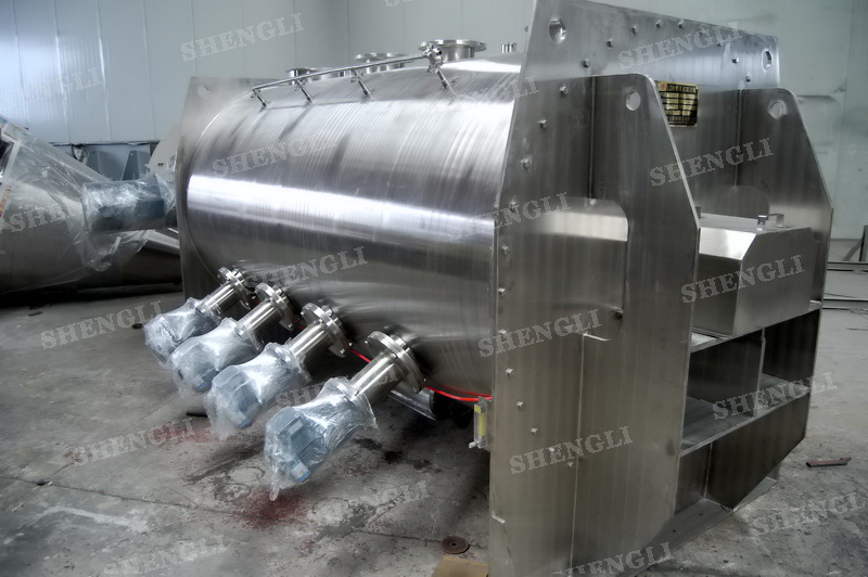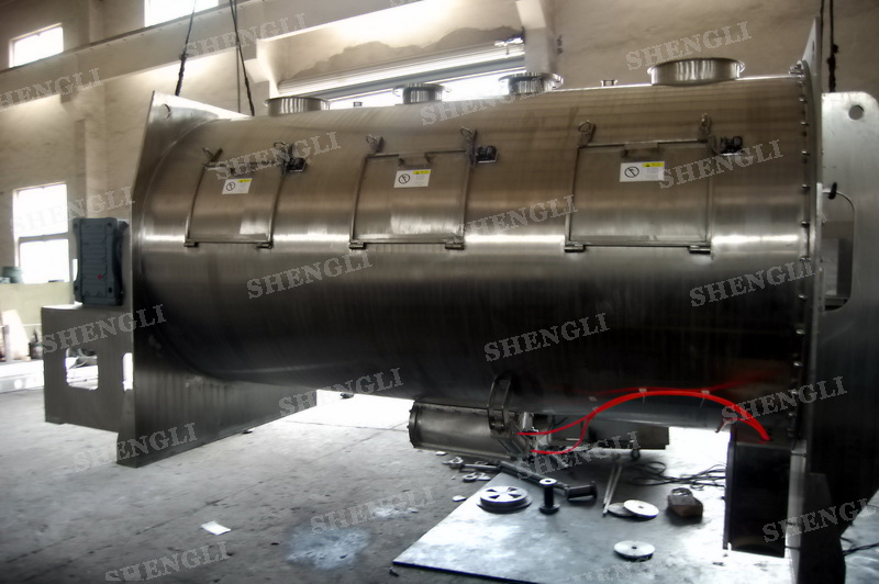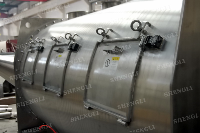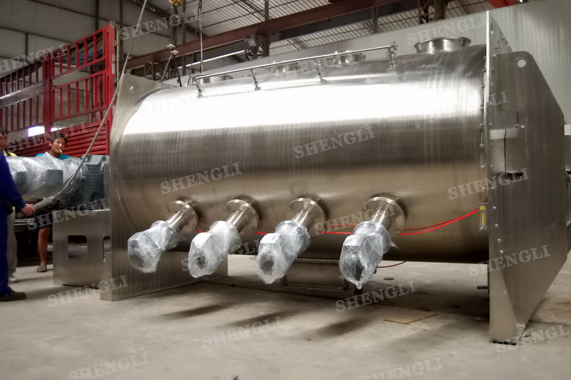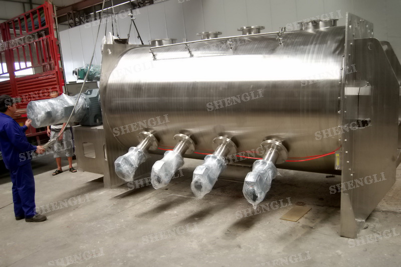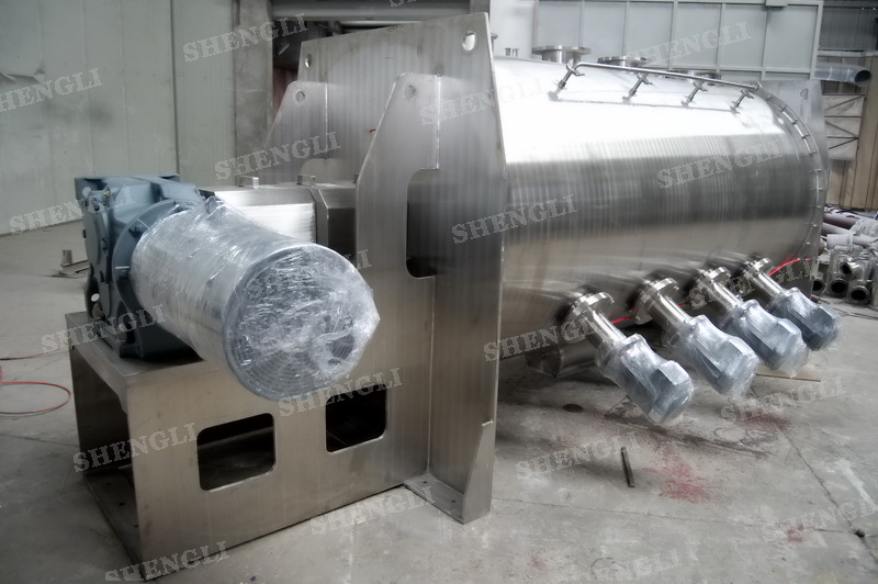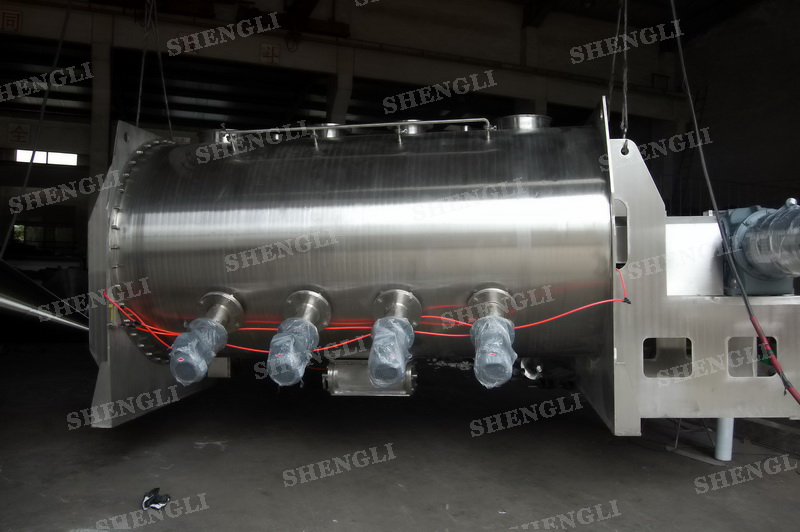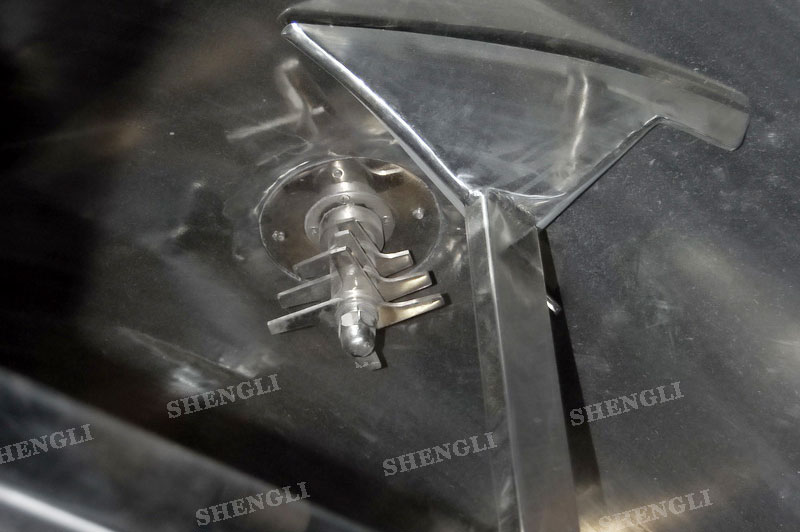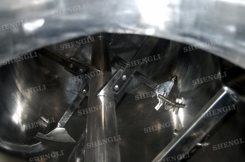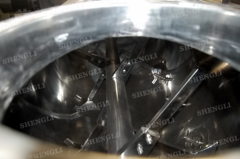 工作原理:犁刀式攪拌機(jī)采用臥式圓柱筒體,內(nèi)設(shè)平行主軸,主軸上安裝若干犁式刀頭,通過(guò)較快的旋轉(zhuǎn)速度,分割、重合物料,實(shí)現(xiàn)快速攪拌的功能,常結(jié)合1500-3000轉(zhuǎn)高速剪切飛刀相互作用。
