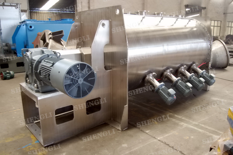 工作原理:犁刀混合機(jī)采用臥式圓柱筒體,內(nèi)設(shè)平行主軸,主軸上安裝若干犁式刀頭,通過(guò)較快的旋轉(zhuǎn)速度,分割、重合物料,實(shí)現(xiàn)快速攪拌的功能,常結(jié)合1500-3000轉(zhuǎn)高速剪切飛刀相互作用。